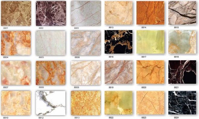 Hiện nay phổ biến nhất có lẽ là tấm nhựa giả đá cẩm thạch, hoa cương. Phù hợp với thẩm mỹ của nhiều khách hàng cũng như là nhiều phong cách kiến trúc của công trình.